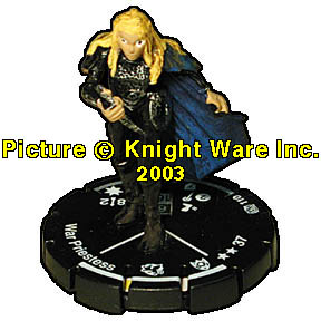 | NAME: War Priestess RANK: Standard FRQ: 4 FACTION: Elven Lords SUB FACTION: Free Armies FIG#: 110 FIG COST: 37 SPEED TYPE: Boot ATTACK TYPE: Wand ATTACK BONUS: 2 DEFENSE TYPE: Immune DAMAGE TYPE: Starburst RANGE: 8 (1 Target) RANGE DAMAGE: 2 FRONT ARC: 90 |