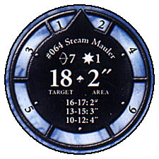 | NAME: Steam Mauler RANK: Weak FRQ: 2 FACTION: Black Powder Revolutionaries SUB FACTION: None FIG#: 64 FIG COST: 61 SPEED TYPE: Boot ATTACK TYPE: Bow ATTACK BONUS: 2 DEFENSE TYPE: Shield DAMAGE TYPE: Golem RANGE: 10 (1 Target) RANGE DAMAGE: 3 FRONT ARC: 90 |