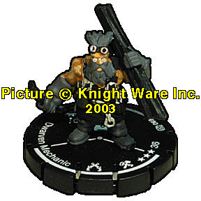 | NAME: Dwarven Mechanic RANK: Tough FRQ: 4 FACTION: Black Powder Revolutionaries SUB FACTION: Northlanders FIG#: 69 FIG COST: 36 SPEED TYPE: Boot ATTACK TYPE: Sword ATTACK BONUS: 0 DEFENSE TYPE: Immune DAMAGE TYPE: Starburst RANGE: 0 (1 Target) RANGE DAMAGE: 0 FRONT ARC: 135 |