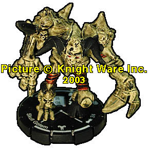 | NAME: Skull Golem RANK: Standard FRQ: 3 FACTION: Dark Crusaders SUB FACTION: None FIG#: 74 FIG COST: 34 SPEED TYPE: Boot ATTACK TYPE: Sword ATTACK BONUS: 0 DEFENSE TYPE: Shield DAMAGE TYPE: Golem RANGE: 0 (1 Target) RANGE DAMAGE: 0 FRONT ARC: 90 |  |