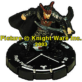 | NAME: Rage Paladin RANK: Weak FRQ: 2 FACTION: Dark Crusaders SUB FACTION: None FIG#: 76 FIG COST: 33 SPEED TYPE: Boot ATTACK TYPE: Sword ATTACK BONUS: 0 DEFENSE TYPE: Shield DAMAGE TYPE: Starburst RANGE: 0 (1 Target) RANGE DAMAGE: 0 FRONT ARC: 90 |