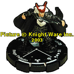 | NAME: Rage Paladin RANK: Tough FRQ: 4 FACTION: Dark Crusaders SUB FACTION: Deathspeakers FIG#: 78 FIG COST: 51 SPEED TYPE: Boot ATTACK TYPE: Sword ATTACK BONUS: 0 DEFENSE TYPE: Shield DAMAGE TYPE: Starburst RANGE: 0 (1 Target) RANGE DAMAGE: 0 FRONT ARC: 90 |