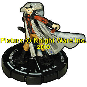 | NAME: Crusader Priest RANK: Tough FRQ: 4 FACTION: Dark Crusaders SUB FACTION: Deathspeakers FIG#: 81 FIG COST: 44 SPEED TYPE: Boot ATTACK TYPE: Wand ATTACK BONUS: 1 DEFENSE TYPE: Shield DAMAGE TYPE: Starburst RANGE: 8 (1 Target) RANGE DAMAGE: 1 FRONT ARC: 90 |
