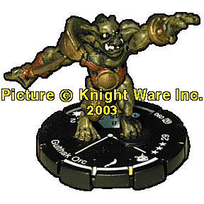 | NAME: Gulthak Orc RANK: Tough FRQ: 5 FACTION: Orc Khans SUB FACTION: Shadow Khans FIG#: 90 FIG COST: 29 SPEED TYPE: Boot ATTACK TYPE: Bow ATTACK BONUS: 1 DEFENSE TYPE: Shield DAMAGE TYPE: Starburst RANGE: 6 (1 Target) RANGE DAMAGE: 2 FRONT ARC: 90 |
