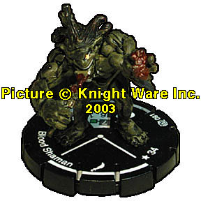 | NAME: Blood Shaman RANK: Weak FRQ: 3 FACTION: Orc Khans SUB FACTION: None FIG#: 91 FIG COST: 34 SPEED TYPE: Wing ATTACK TYPE: Wand ATTACK BONUS: 2 DEFENSE TYPE: Shield DAMAGE TYPE: Starburst RANGE: 8 (1 Target) RANGE DAMAGE: 2 FRONT ARC: 90 |
