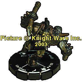 | NAME: Ub-Khan RANK: Standard FRQ: 4 FACTION: Orc Khans SUB FACTION: Shadow Khans FIG#: 98 FIG COST: 53 SPEED TYPE: Boot ATTACK TYPE: Sword ATTACK BONUS: 2 DEFENSE TYPE: Shield DAMAGE TYPE: Starburst RANGE: 8 (1 Target) RANGE DAMAGE: 2 FRONT ARC: 90 |