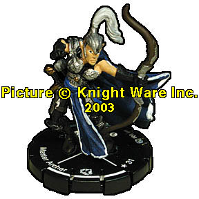 | NAME: Master Archer RANK: Weak FRQ: 3 FACTION: Elven Lords SUB FACTION: None FIG#: 106 FIG COST: 31 SPEED TYPE: Boot ATTACK TYPE: Bow ATTACK BONUS: 2 DEFENSE TYPE: Shield DAMAGE TYPE: Starburst RANGE: 12 (1 Target) RANGE DAMAGE: 2 FRONT ARC: 90 |