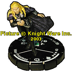 | NAME: War Priestess RANK: Tough FRQ: 5 FACTION: Elven Lords SUB FACTION: Temple Masters FIG#: 111 FIG COST: 40 SPEED TYPE: Boot ATTACK TYPE: Sword ATTACK BONUS: 2 DEFENSE TYPE: Shield DAMAGE TYPE: Starburst RANGE: 6 (1 Target) RANGE DAMAGE: 2 FRONT ARC: 135 |