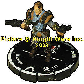 | NAME: Blackwyn RANK: Unique FRQ: 6 FACTION: Black Powder Revolutionaries SUB FACTION: Northlanders FIG#: 119 FIG COST: 117 SPEED TYPE: Boot ATTACK TYPE: Bow ATTACK BONUS: 0 DEFENSE TYPE: Shield DAMAGE TYPE: Starburst RANGE: 10 (2 Targets) RANGE DAMAGE: 3 FRONT ARC: 180 |