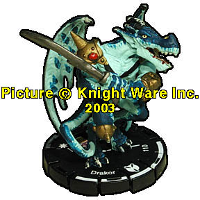 | NAME: Drakor RANK: Unique FRQ: 6 FACTION: Draconum SUB FACTION: None FIG#: 127 FIG COST: 110 SPEED TYPE: Wing ATTACK TYPE: Sword ATTACK BONUS: 0 DEFENSE TYPE: Shield DAMAGE TYPE: Starburst RANGE: 0 (1 Target) RANGE DAMAGE: 0 FRONT ARC: 135 |