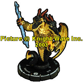 | NAME: Vithzerai RANK: Unique FRQ: 6 FACTION: Draconum SUB FACTION: None FIG#: 129 FIG COST: 214 SPEED TYPE: Wing ATTACK TYPE: Wand ATTACK BONUS: 1 DEFENSE TYPE: Shield DAMAGE TYPE: Starburst RANGE: 14 (1 Target) RANGE DAMAGE: 5 FRONT ARC: 180 |