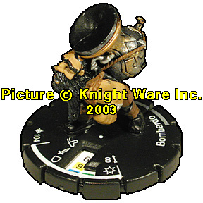 | NAME: BOMBARDO RANK: PROMO L5 FRQ: LE 5 FACTION: BLACK POWDER REBELS UNIT COST: 30 FIG#: 104 RANGE: 8 ARC: 90 |