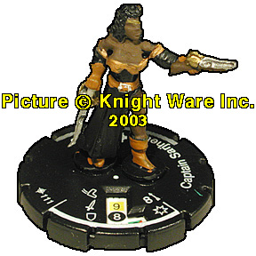 | NAME: CAPTAIN SARJHET RANK: PROMO L4 FRQ: LE 4 FACTION: ATLANTIS GUILD UNIT COST: 29 FIG#: 111 RANGE: 8 ARC: 90 |
