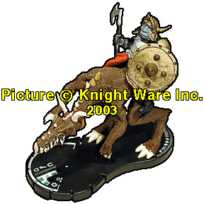 | NAME: HORNED HATCHETKRUGG ON HORNED DRAKE RANK: TOUGH FRQ: 5 FACTION: MAGE SPAWN UNIT COST: 44 FIG#: 111 RANGE: 0 ARC: 180 |