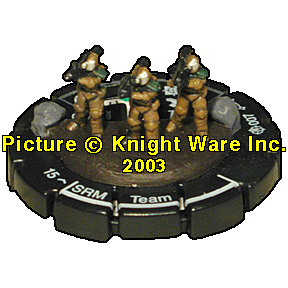 | PILOT NAME: N/A TYPE: SRM Team RANK: Green FRQ: 1 CLAN: Highlanders FIG#: 7 FIG COST: 15 DAMAGE TYPE: Ballistic RANGE: 0/10 (N/A) - 1 Target(s) ARC: 90 |
