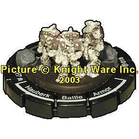 | PILOT NAME: N/A TYPE: Hauberk Battle Armor RANK: Elite FRQ: 3 CLAN: Spirit Cats FIG#: 18 FIG COST: 27 DAMAGE TYPE: Ballistic RANGE: 4/14 (N/A) - 1 Target(s) ARC: 135 |