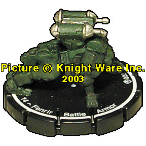 | PILOT NAME: N/A TYPE: Fenrir Battle Armor RANK: Green FRQ: 1 CLAN: Swordsworn FIG#: 22 FIG COST: 14 DAMAGE TYPE: Ballistic RANGE: 0/6 (N/A) - 2 Target(s) ARC: 270 |