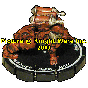 | PILOT NAME: N/A TYPE: Fenrir Battle Armor RANK: Elite FRQ: 3 CLAN: Dragon's Fury FIG#: 24 FIG COST: 18 DAMAGE TYPE: Energy RANGE: 0/8 (N/A) - 1 Target(s) ARC: 270 |