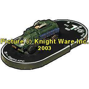 | PILOT NAME: N/A TYPE: Giggins APC RANK: Green FRQ: 2 CLAN: Swordsworn FIG#: 28 FIG COST: 26 DAMAGE TYPE: Ballistic RANGE: 0/6 (N/A) - 1 Target(s) ARC: 360 TRANSPORT CAP: 2 |