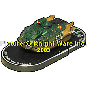 | PILOT NAME: N/A TYPE: Maxim Mk2 Transport RANK: Elite FRQ: 4 CLAN: Highlanders FIG#: 33 FIG COST: 34 DAMAGE TYPE: Ballistic RANGE: 0/6 (N/A) - 1 Target(s) ARC: 360 TRANSPORT CAP: 3 |