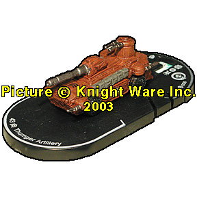 | PILOT NAME: N/A TYPE: Thumper Artillery RANK: Elite FRQ: 4 CLAN: Dragon's Fury FIG#: 36 FIG COST: 43 DAMAGE TYPE: Ballistic RANGE: 3/12 (24 ) - 2 Target(s) ARC: 135 |