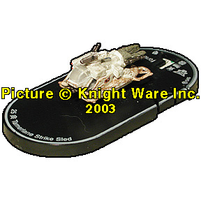 | PILOT NAME: N/A TYPE: Tamerlane Strike Sled RANK: Elite FRQ: 4 CLAN: Spirit Cats FIG#: 45 FIG COST: 25 DAMAGE TYPE: Energy RANGE: 0/10 (N/A) - 1 Target(s) ARC: 360 |