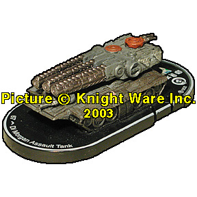 | PILOT NAME: N/A TYPE: DI Morgan Assault Tank RANK: Green FRQ: 2 CLAN: Dragon's Fury FIG#: 52 FIG COST: 67 DAMAGE TYPE: Energy RANGE: 2/10 (N/A) - 3 Target(s) ARC: 360 |