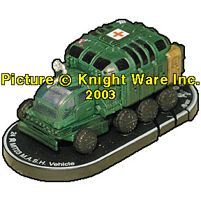 | PILOT NAME: N/A TYPE: MIT23 M.A.S.H.Vehicle RANK: Elite FRQ: 4 CLAN: Highlanders FIG#: 57 FIG COST: 24 DAMAGE TYPE: Ballistic RANGE: 0/0 (N/A) - 1 Target(s) ARC: 360 |