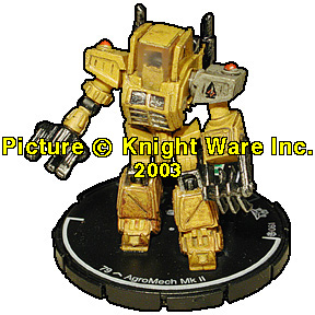 | NAME: N/A 'MECH TYPE: AgroMech Mk II RANK: Green FRQ: 3 CLAN: Spirit Cats FIG#: 61 FIG COST: 79 PRIMARY DAMAGE: Energy PRIMARY RANGE: 0/0 - 1 Target SECONDARY DAMAGE: Melee SECONDARY RANGE: 0/0 - 1 Target ARC: 180 VENT: 2 |