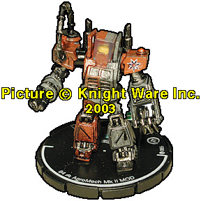 | NAME: N/A 'MECH TYPE: AgroMech Mk II MOD RANK: Veteran FRQ: 4 CLAN: Dragon's Fury FIG#: 65 FIG COST: 84 PRIMARY DAMAGE: Energy PRIMARY RANGE: 0/0 - 1 Target SECONDARY DAMAGE: Melee SECONDARY RANGE: 0/0 - 1 Target ARC: 180 VENT: 3 |