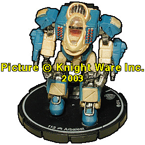| NAME: N/A 'MECH TYPE: Arbalest RANK: Veteran FRQ: 4 CLAN: Bannson's Raiders FIG#: 74 FIG COST: 113 PRIMARY DAMAGE: Energy PRIMARY RANGE: 0/8 - 2 Targets SECONDARY DAMAGE: Ballistic SECONDARY RANGE: 4/14 - 1 Target ARC: 270 VENT: 3 |