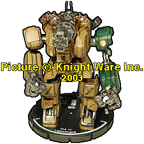 | NAME: N/A 'MECH TYPE: Legionnaire RANK: Green FRQ: 3 CLAN: Highlanders FIG#: 79 FIG COST: 114 PRIMARY DAMAGE: Melee PRIMARY RANGE: 0/0 - 1 Target SECONDARY DAMAGE: Ballistic SECONDARY RANGE: 3/12 - 1 Target ARC: 135 VENT: 2 |