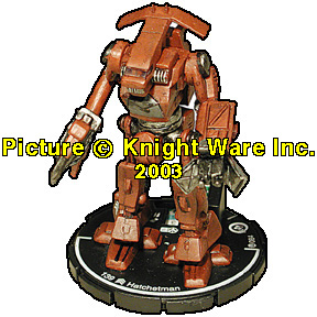 | NAME: N/A 'MECH TYPE: Hatchetman RANK: Elite FRQ: 5 CLAN: Dragon's Fury FIG#: 84 FIG COST: 139 PRIMARY DAMAGE: Melee PRIMARY RANGE: 0/0 - 1 Target SECONDARY DAMAGE: Energy SECONDARY RANGE: 3/8 - 2 Targets ARC: 180 VENT: 2 |