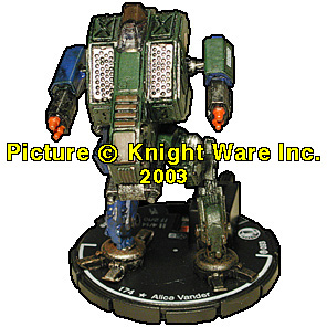 | NAME: Alice Vander 'MECH TYPE: Vulture RANK: Unique FRQ: 6 CLAN: Swordsworn FIG#: 93 FIG COST: 174 PRIMARY DAMAGE: Ballistic PRIMARY RANGE: 4/12 - 2 Targets SECONDARY DAMAGE: Energy SECONDARY RANGE 2/10 2 Targets ARC: 180 VENT: 2 |